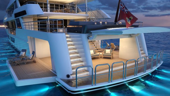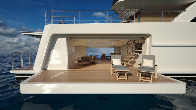 The tenders and toys are to port and starboard of the beach club, and once launched the free space in addition to the fold-down side terraces further increases the area available to guests beside the water.