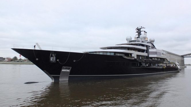 Launched in 2019, 135m/442.9ft motor yacht CRESCENT (ex.PROJECT THUNDER) from Lürssen is on the cutting edge of technology and has attracted the eyes of luxury yacht aficionados and curious holidaymakers by her sheer size, stately black hull and on-trend raked bow.