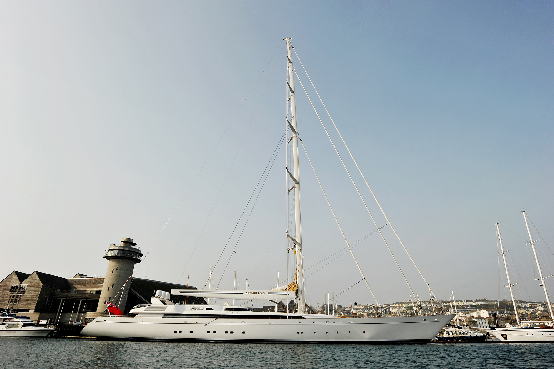 This image is featured as part of the article The World´s Largest Sailing Yacht M5 (ex MIRABELLA V) arrives at Pendennis for a one-year refit.