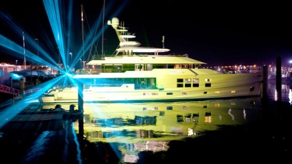 Yacht Big Fish will take a detour from its circumnavigation in October and November to make a one-month stop in Fort Lauderdale during the Fort Lauderdale International Boat Show to showcase the quality of its design and construction and its innovative features, which include the first use of granite decking, its extraordinary 25-foot-high HD TV screen, and folding stern “beach” bulwarks.