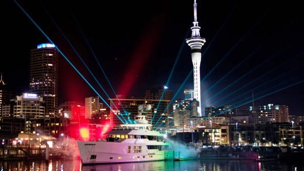 Auckland, New Zealand – The City of Sails was transformed into the City of Lights for two nights May 21st and 22nd by fantastic laser shows in Auckland’s Viaduct in celebration of the completion and launch of yacht Big Fish.