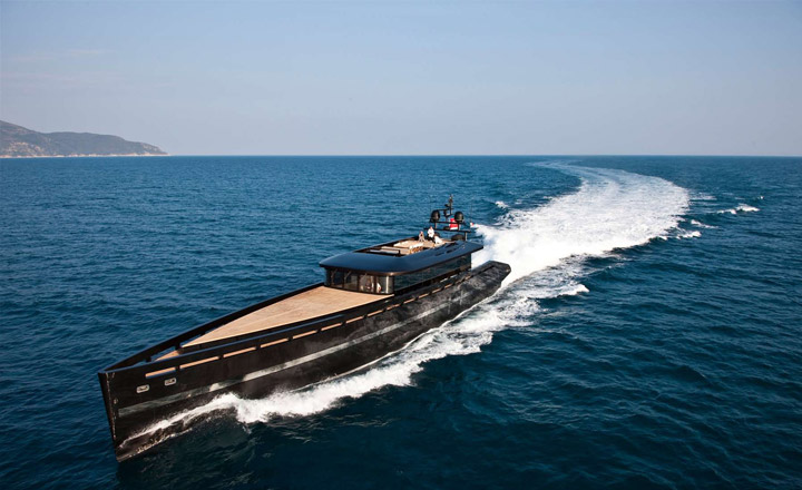 The yacht was built at the MMGI Shipyard, with the collaboration of the interior designers at Studio A-Lab, the naval architect Mario Grasso of Navirex. The owner also had personal involvement during the build and is very proud of this innovative project. This unique motor yacht H2OME is one of the few yachts to have a double hull configuration that can be both displacement and planning hull due to the third water jet. Thanks to her narrow and long bottom, the ‘double speed’ hull at 20 knots, allows navigation in displacement speed, for economical and comfortable navigation, whereas the planning hull allows navigation in surfing speed reaching a maximum speed up to 36 knots.