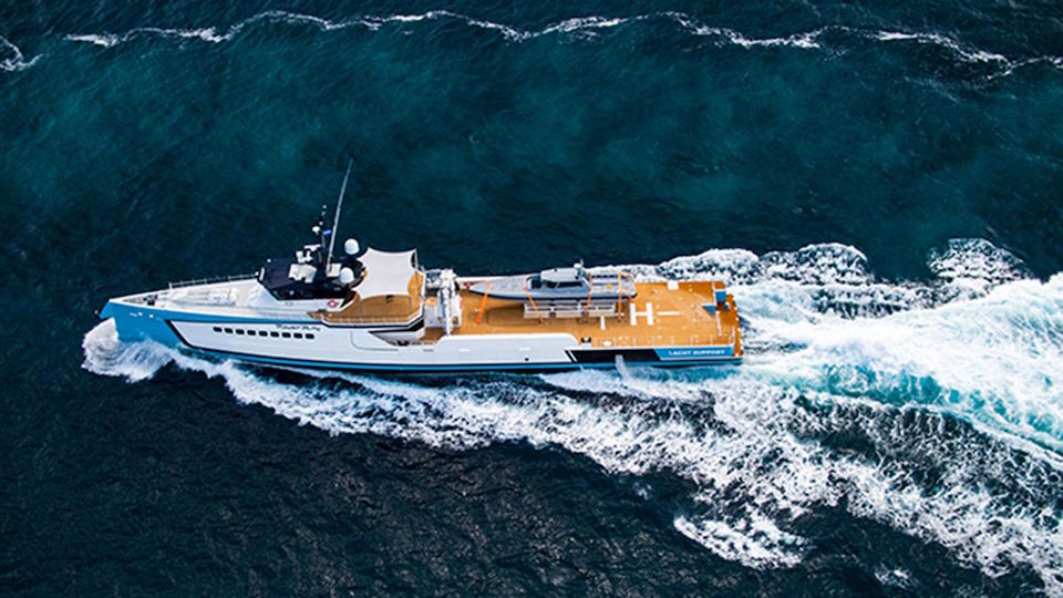 This image is featured as part of the article Yacht Support Vessel Power Play on sea trials.