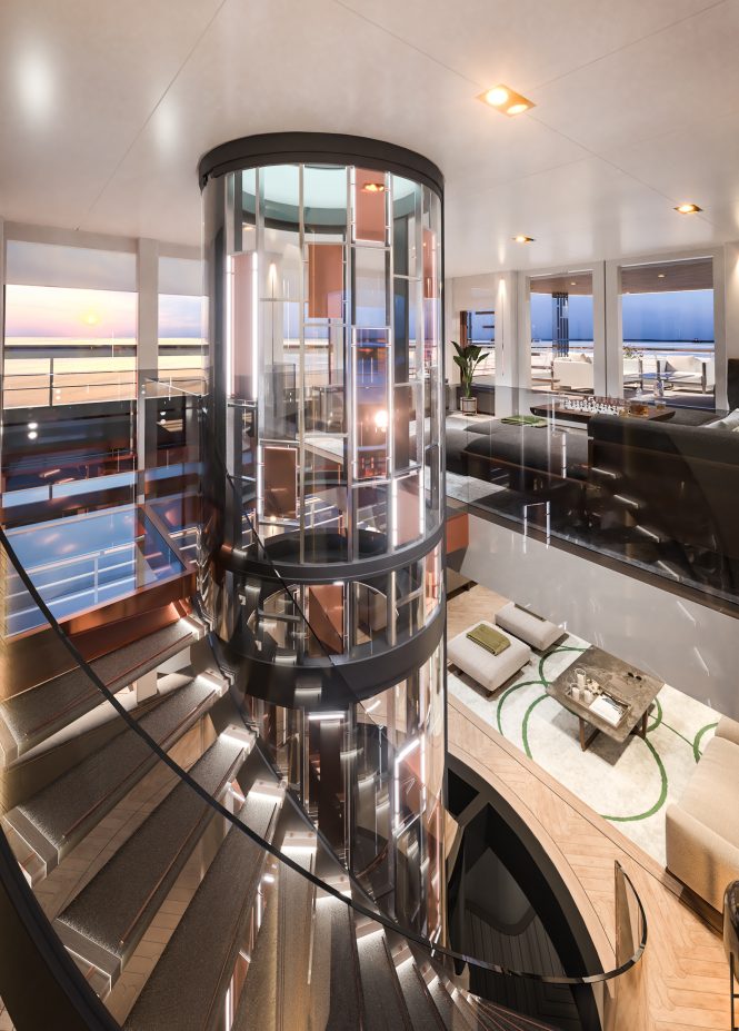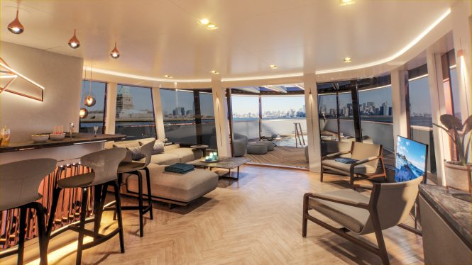 The design, which has been described by Vripack as ‘revolutionary’, uses a pre-engineered platform capable of supporting a variety of superstructures. The interior layout is just as unique, placing an emphasis on multi-use living areas to attract the younger generations of superyacht owners.