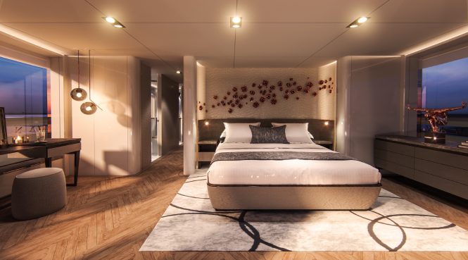 Direct access is given from the beach club to three of the guest cabins, which include two VIP staterooms and two twin cabins which all benefit from en-suite facilities. The upper deck is the second floor dedicated to family living and privacy, and the Master suite to the aft receives 180 views through the full-height windows and glass sliding doors that lead out onto the foredeck terrace complete with spa pool.
