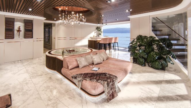 The layout places a sauna and steam room off the beach club, which itself contains a centrepiece Jacuzzi and a bar. Fold-down bulwarks open the interior up to the gentle sea breezes and an expansive swim platform creates the ideal sunbathing area or casual party environment close to transparent seas.